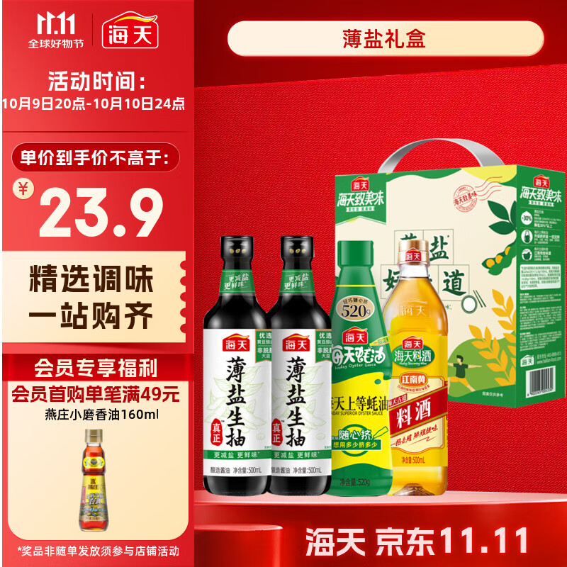 海天 礼盒系列 生抽酱油500ml*2 蚝油520g 料酒500ml 薄盐礼盒https://u.jd.com/0gWf50o
