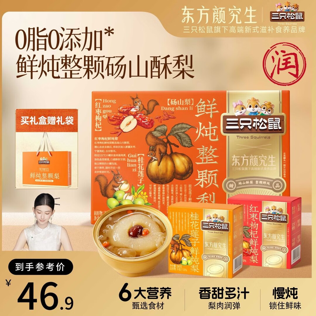 湖南等地29.9亓 三只松鼠东方颜究生鲜炖整颗梨礼盒260g*6碗