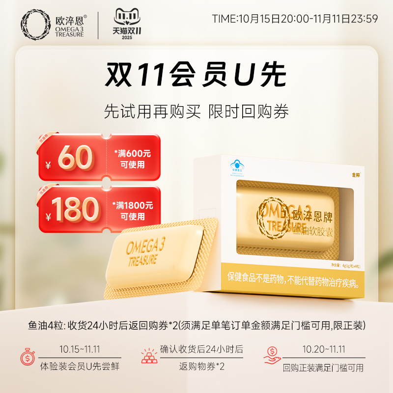 1亓 欧淬恩95%高纯度omega3金装深海鱼油软胶囊4粒