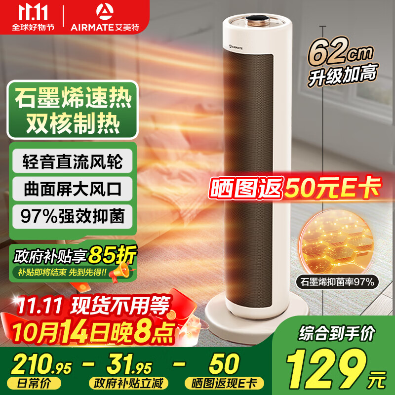艾美特双核石墨烯暖风机 叠国补拍下115.9亓起 晒单饭50E卡到手65.