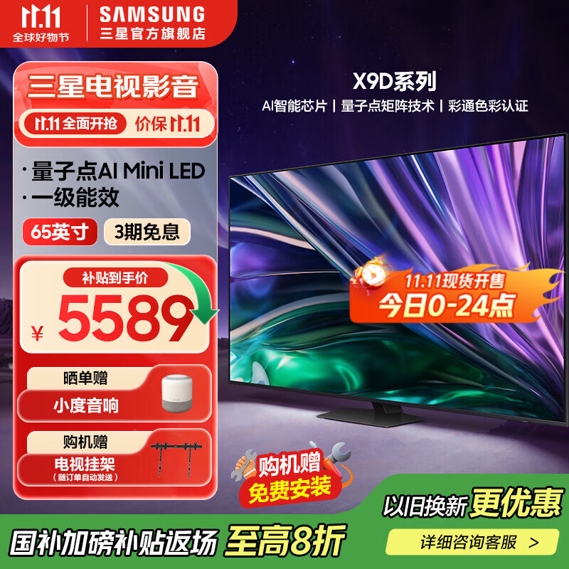 三星QNX9D系列电视 领9折券 限时4小时下单送500亓E卡 赠电视