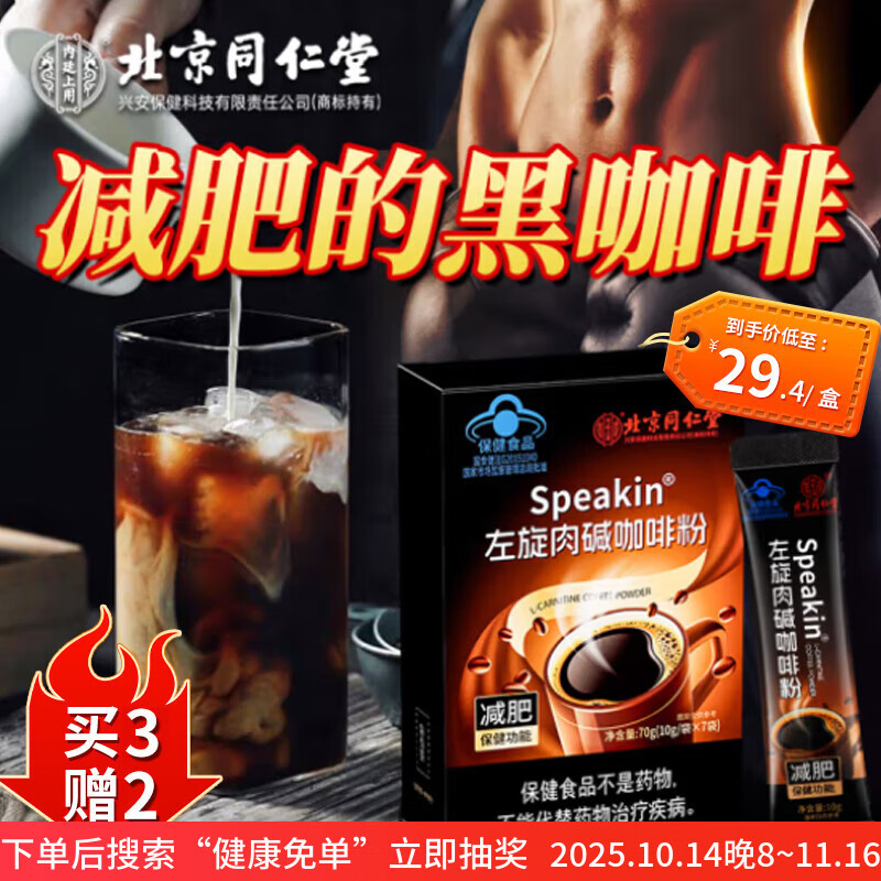 北京同仁堂左旋肉碱减肥黑咖啡 10g/袋*7袋,有首单,4.11