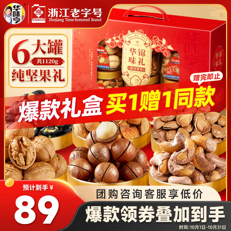 3件83元 华味亨华味锦礼礼盒1220g/6罐纯坚果