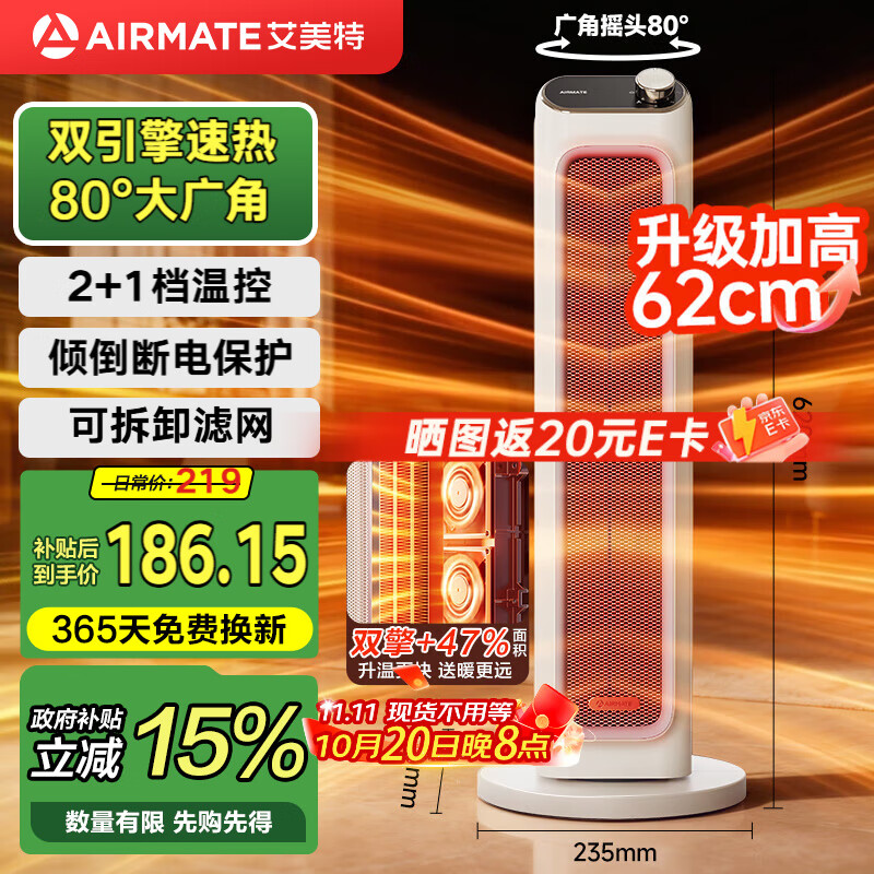 艾美特双直流速热暖风机塔式 商品标题下领9折券 叠国补拍下145.3亓 收
