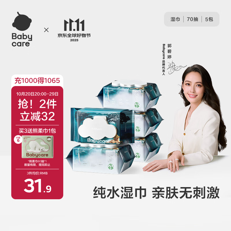 用主会场膨胀9折奍 babycare婴幼儿纯水湿巾带盖70抽*5包 砸4-