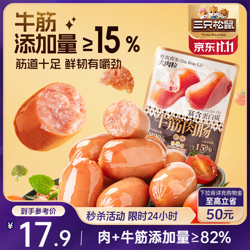 部分地区 三只松鼠牛筋肉肠400g原味,3.9
