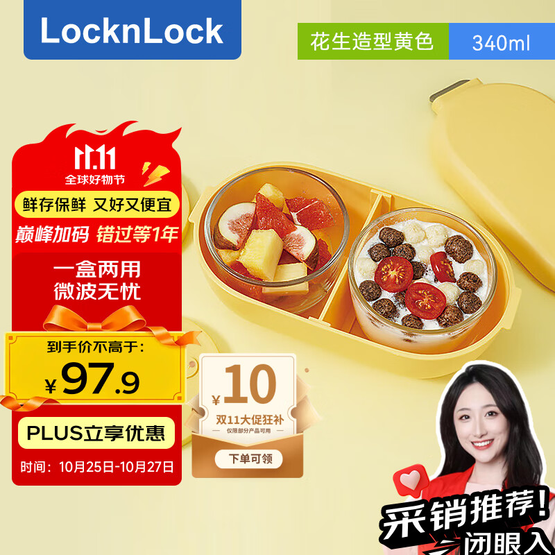 乐扣乐扣 花生造型耐热玻璃饭盒微波炉便当盒 1.1L 340ML*2