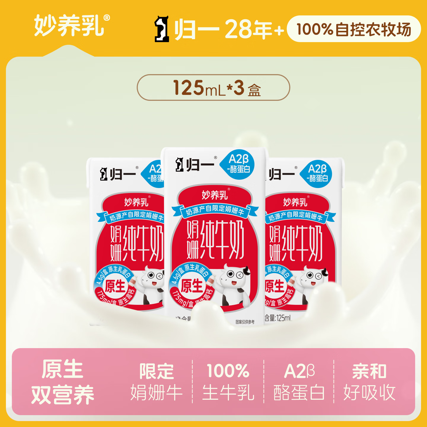 归一妙养如A2娟姗原生高钙儿童纯奶125ml*3盒,1.9