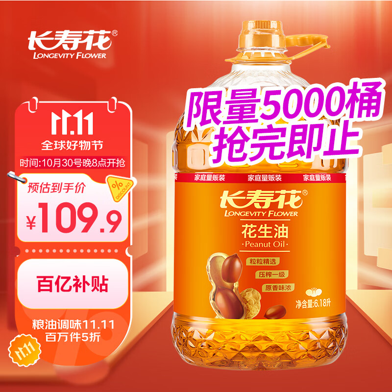 长寿花压榨一级花生油6.18L 扫码领小程序9折券89.9亓 需#小程