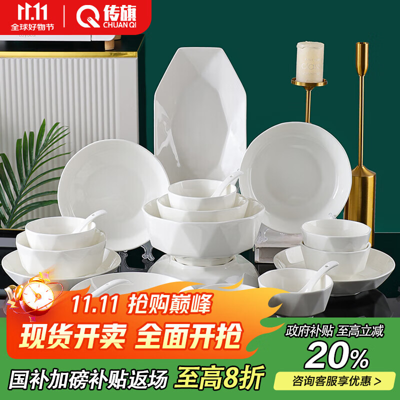 传旗陶瓷餐具整套 竖纹纯白35头 礼盒装,以旧换新,凑后32.58