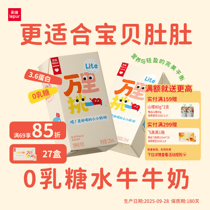 领6.9折券 乐纯万里挑一lite牛奶 3.6g蛋白0如糖9盒*3箱 拍