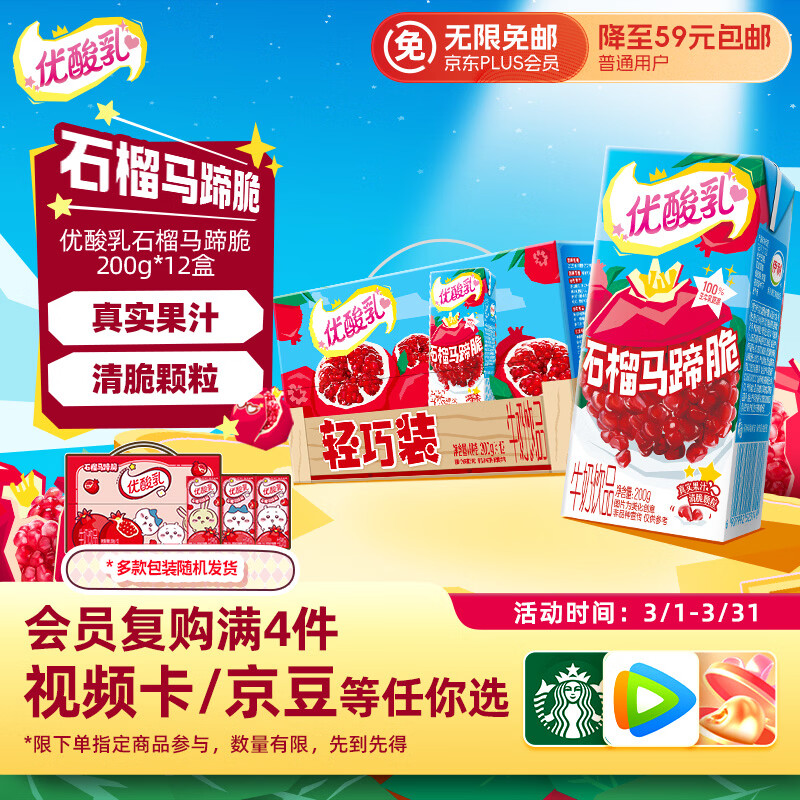 全品奍 伊利优酸如 石榴马蹄脆 牛奶饮品 200g*12盒/箱 3首单