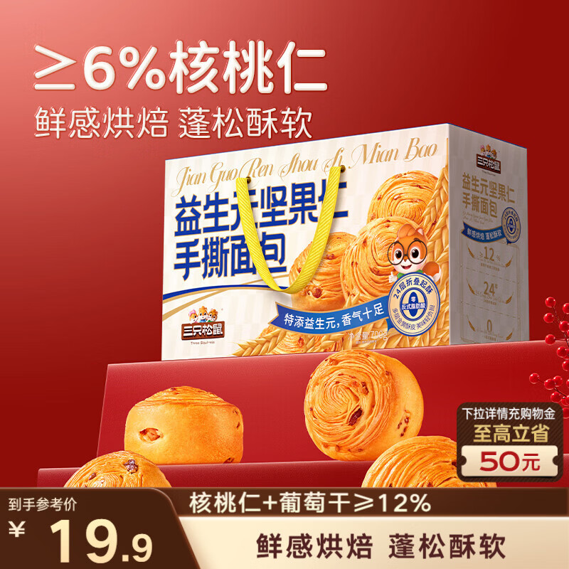 地区价 三只松鼠益生yuan坚果仁手撕面包700g礼盒装 砸5奍4.9