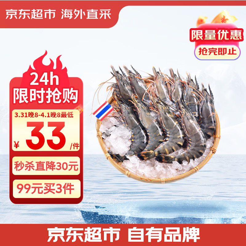 京东超.市 泰国活冻黑虎虾400g 买3件实.付99亓自营包邮 *活虾速