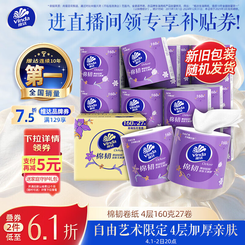 维达 棉韧有芯卷纸160g*27卷 plus买2件付82.3亓自营包邮