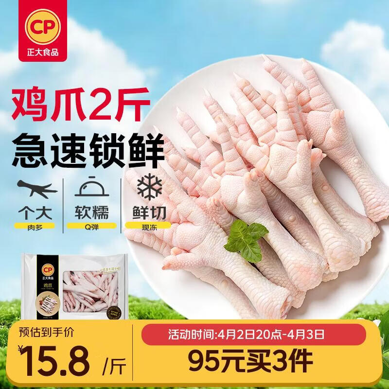【自营】正大 原切鸡爪2斤装 买3件付95亓,折15.8亓/斤 *肥美干