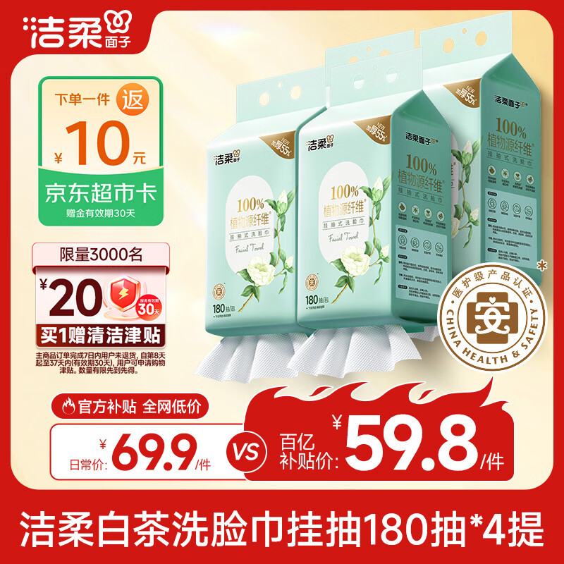 洁柔洗脸巾白茶悬挂式180抽4提,买3件