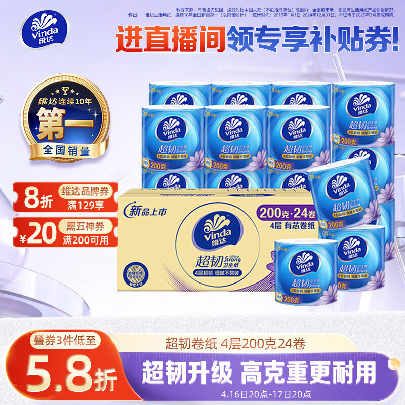 先领200-20补帖卷 【自营】有芯卷纸200g*24卷 买3件128