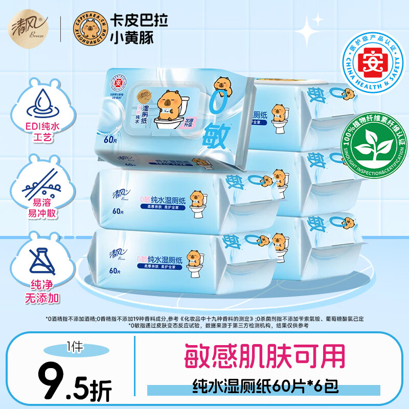 清风 纯水湿厕纸家庭装60片*6包,2首单,拍2件,凑后每件20.39/赠5元清洁津贴https://u.jd.com/jaEhucz