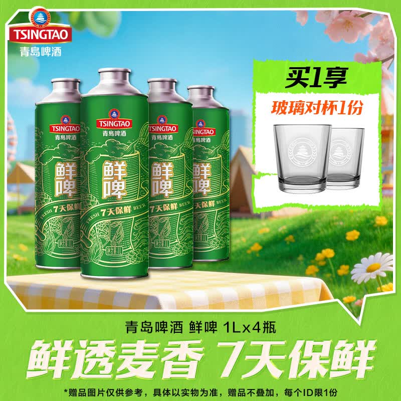青岛啤酒 10度鲜啤1L*4桶装 买2件109.8亓,赠酒杯*4 *7天