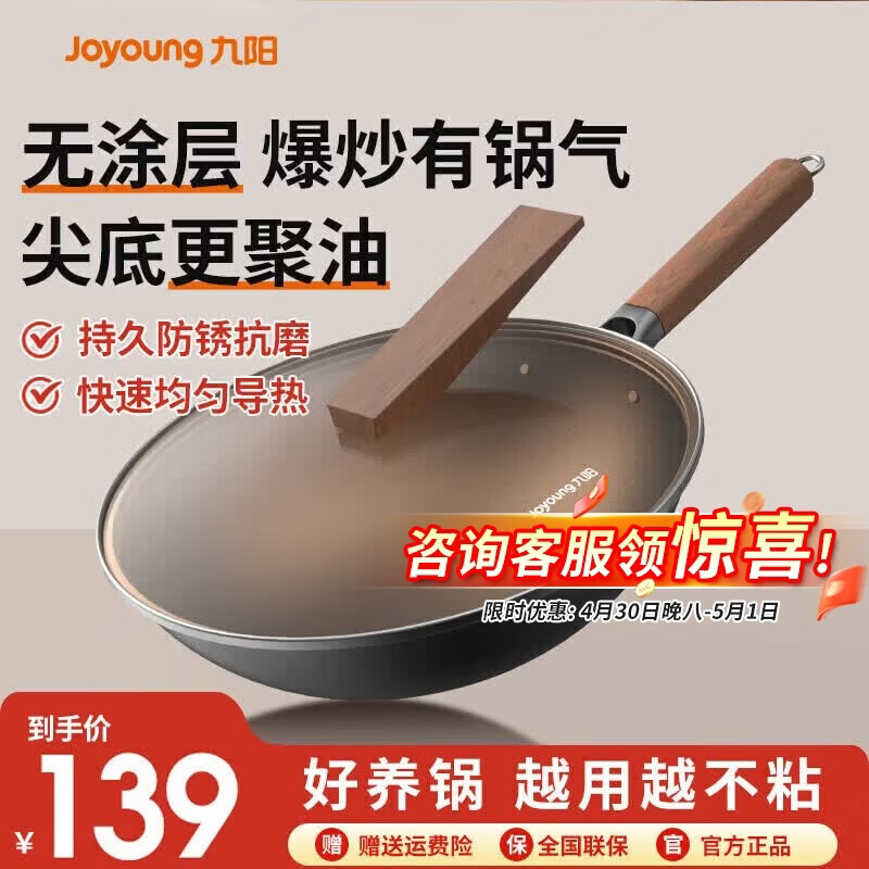 先领5折补帖卷 九阳 无涂层精铁炒锅带盖30cm 69.5亓,高纯精铁